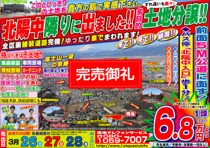 北陽中隣に出ました!!多目的土地分譲 2016-03-162021-10-11 Staff販売物件広告 このとびっきりの土地をあなたの肌で実感ください。 北陽中隣に出ました!!多目的土地分譲!すれ違いも楽々。 →チラシをPDFで見る